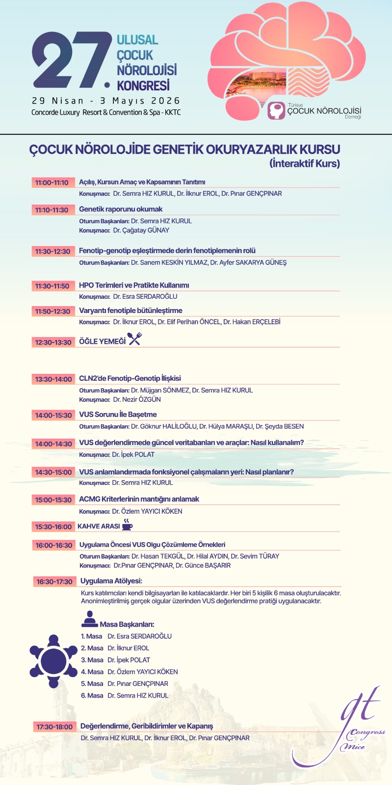 “Çocuk Nörolojide Genetik Okuryazarlık Kursu” 50 kişilik kontenjana sahip olup kursa 25 yandal eğitimi alan, 15 uzmanlığını almış ve 10 akademik ünvana sahip akademisyen dahil edilecektir. Kaydınız sonrası kesin katılım bilginiz tarafınıza bildirilecektir.